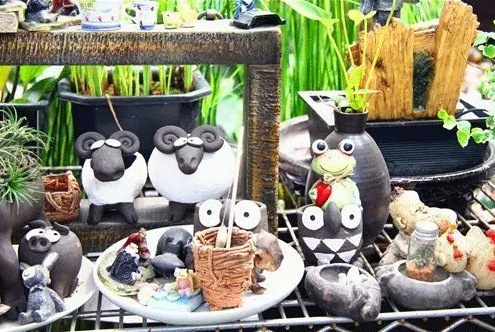 市場內(nèi)銷售水生植物的攤位制作的小水景