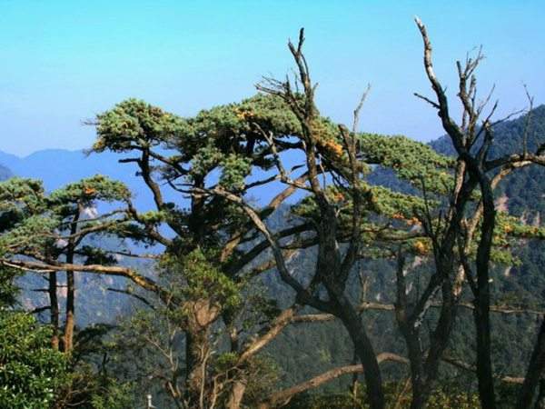 華南五針?biāo)蓪偎煽扑蓪傥遽標(biāo)山M,是松科中最原始、最古老的一族,為我國特有樹種,1999年被確定為國家Ⅱ級重點(diǎn)保護(hù)野生植物,主要分布在廣東、廣西、湖南、貴州海拔700米—1600米的亞熱帶山地。到了冬天,為了適應(yīng)懸崖峭壁的嚴(yán)酷環(huán)境,華南五針?biāo)蓵置诔鲆环N白色防寒物質(zhì),成為與眾不同的“藍(lán)松”,有時甚至呈現(xiàn)出光彩奪目的粉藍(lán)色。